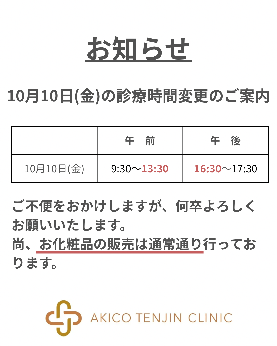 10月10日(金)の診療時間変更のご案内